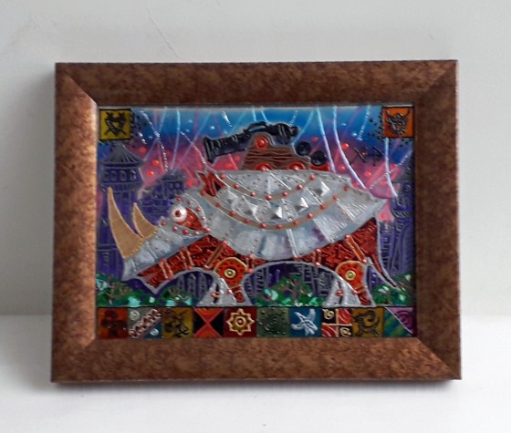Размер живописного поля: 200х150 (мм) (габариты с рамой "под медь" 240х190 мм). Брутальный носорог в стальных доспехах готов к штурму крепости. Картина выполнена импортными витражными красками и контурами по стеклу и украшена декором. Военным людям и любителям фэнтези этот витраж будет оригинальным уместным подарком! Мои картины обрели счастливых хозяев не только в разных городах Украины и СНГ,но и в США и Германии. Присоединяйтесь! (Доставка : =Новая почта= или самовывоз)