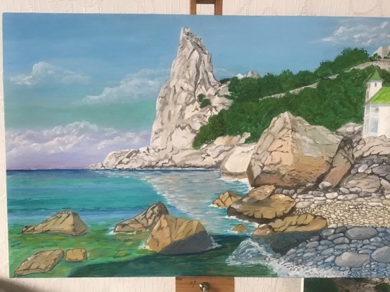 Интерьерная картина морской пейзаж на ДВП на подрамнике с прорисованными торцами, написанный акриловыми красками и покрыт лаком переместит Вас в милый сердцу уголок Симеиза Пляж между Дивой и Лебединым крылом