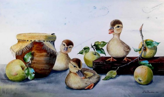 Время шло. Гусята подрастали. Конечно же, хозяйка не жалея подсыпала им в кормушку и толчёные крупы, и размоченные в воде хлебные корки, и отварной картофель с кашами, но малышам всё равно хотелось чего-нибудь новенького, необычного. Иногда они забирались в кладовку и усаживались вокруг старого глиняного горшка надёжно закрытого плотной холстиной. От нечего делать, гусята пощипывали за бока спелые сочные яблоки, лежавшие на полках, и шумно фантазировали, пытаясь предположить, что же такого вкусного находится внутри загадочного горшка?